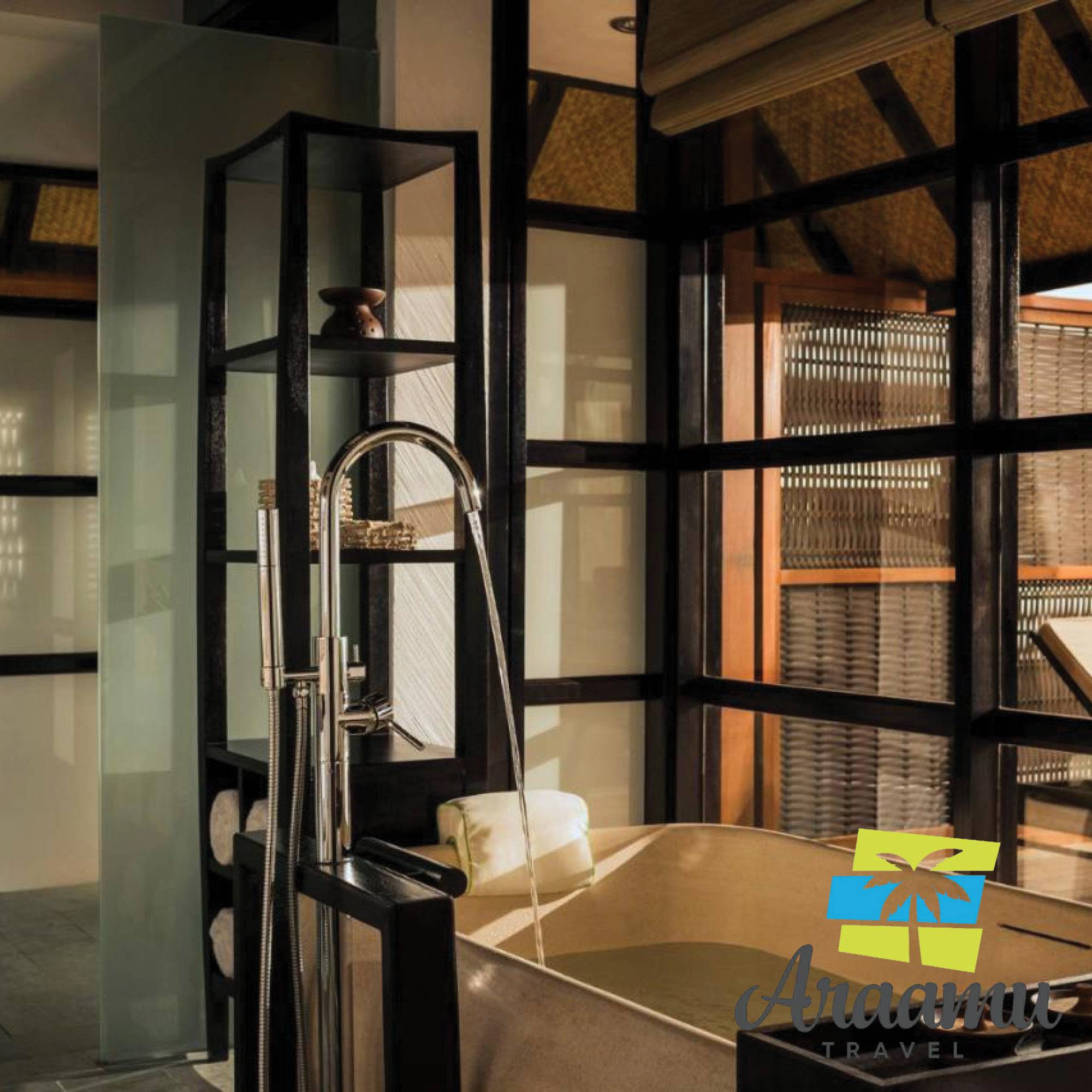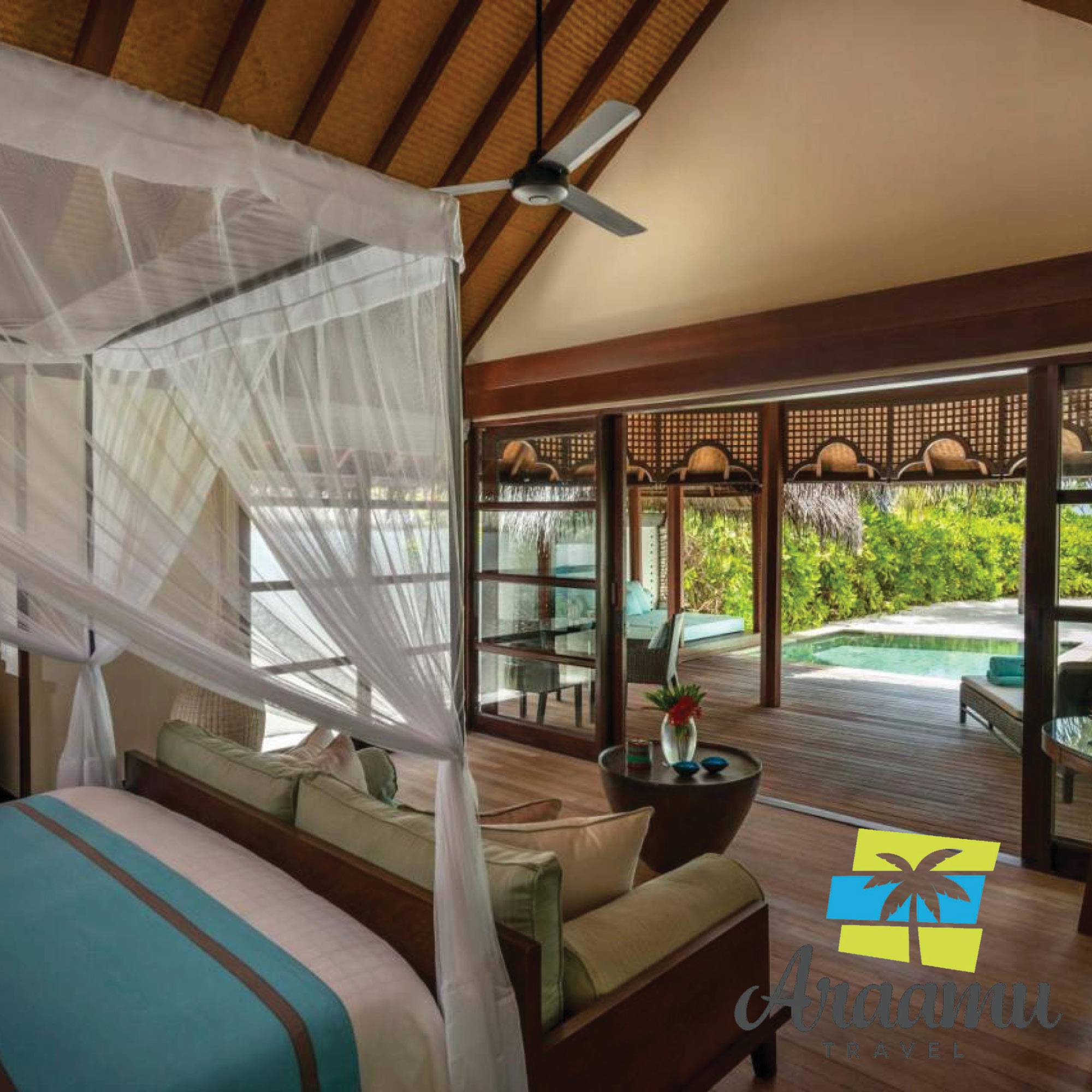 A 96 pavilon és bungaló közvetlenül a fehér homokos tengerparton található, vagy a lagúna felett cölöpökre építve. Ízlésen berendezettek. Felszereltség: nagyméretű franciaágy vagy két különálló ágy, fürdőszoba, fürdőkád, zuhany, kinti zuhany, hajszárító, tv, telefon, internet, DVD-lejátszó, minibár, tea/kávéfőző, szobai széf, klíma és mennyezeti ventilátor.