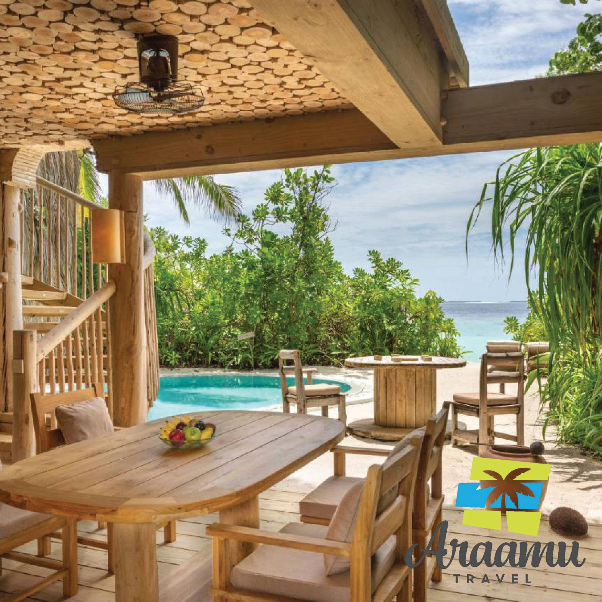 Soneva Fushi Villa Suite medencével (9, ebből 7 privát medencével): kb. 594 nm (kb. 96 nm lakrész): külön nappalival és hálószobával és medencével.