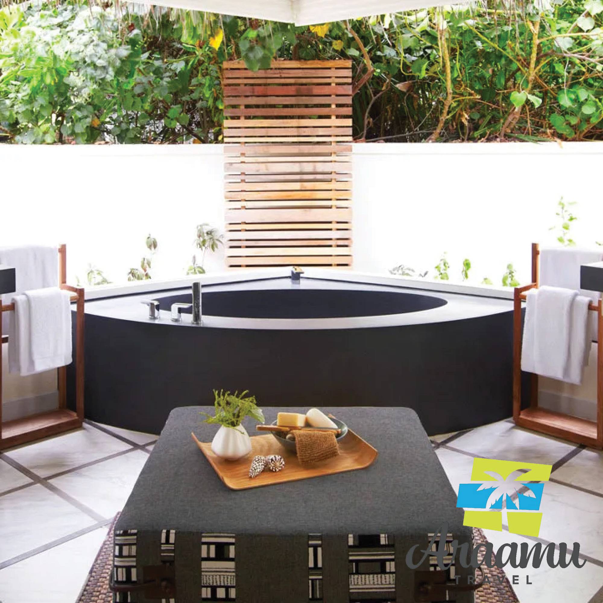 A 61 kis házacskát a legmagasabb előírásoknak megfelelően a privátszféra és a nagyvonalúság jegyében építették meg a part mentén, vagy a lagúna fölött. Felszereltség: fürdőszoba nagy káddal és kabinos zuhannyal, fürdőköntös, hajszárító, nagyszabású kinti rész. Mindegyik villa bútorozott napozóterasszal és nagy merülő medencével rendelkezik.