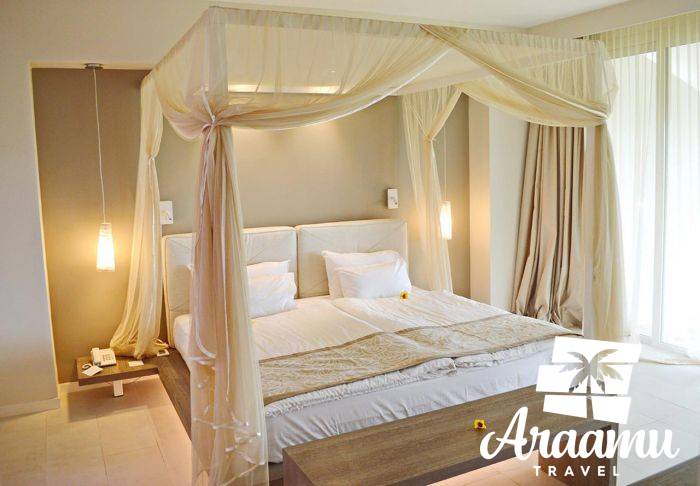Deluxe szoba (93): kb. 35 nm, modern és kényelmesen felszerelt, fürdőkád / WC, hajszárító, TV, telefon, WLAN, légkondicionáló, mennyezeti ventilátor, minibár, kávé / teafőző, széf, szúnyogháló, tengerre néző terasz és közvetlen kertkapcsolat.