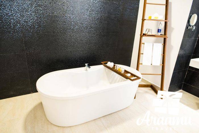 Superior Deluxe: olyan, mint a Superior, a fürdőszobában térben álló kád és külön zuhanyzó van. Kertre, medencékre és tengerre néző kilátás.